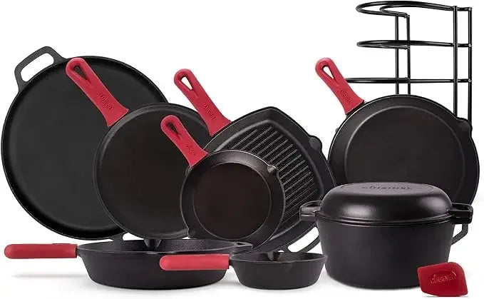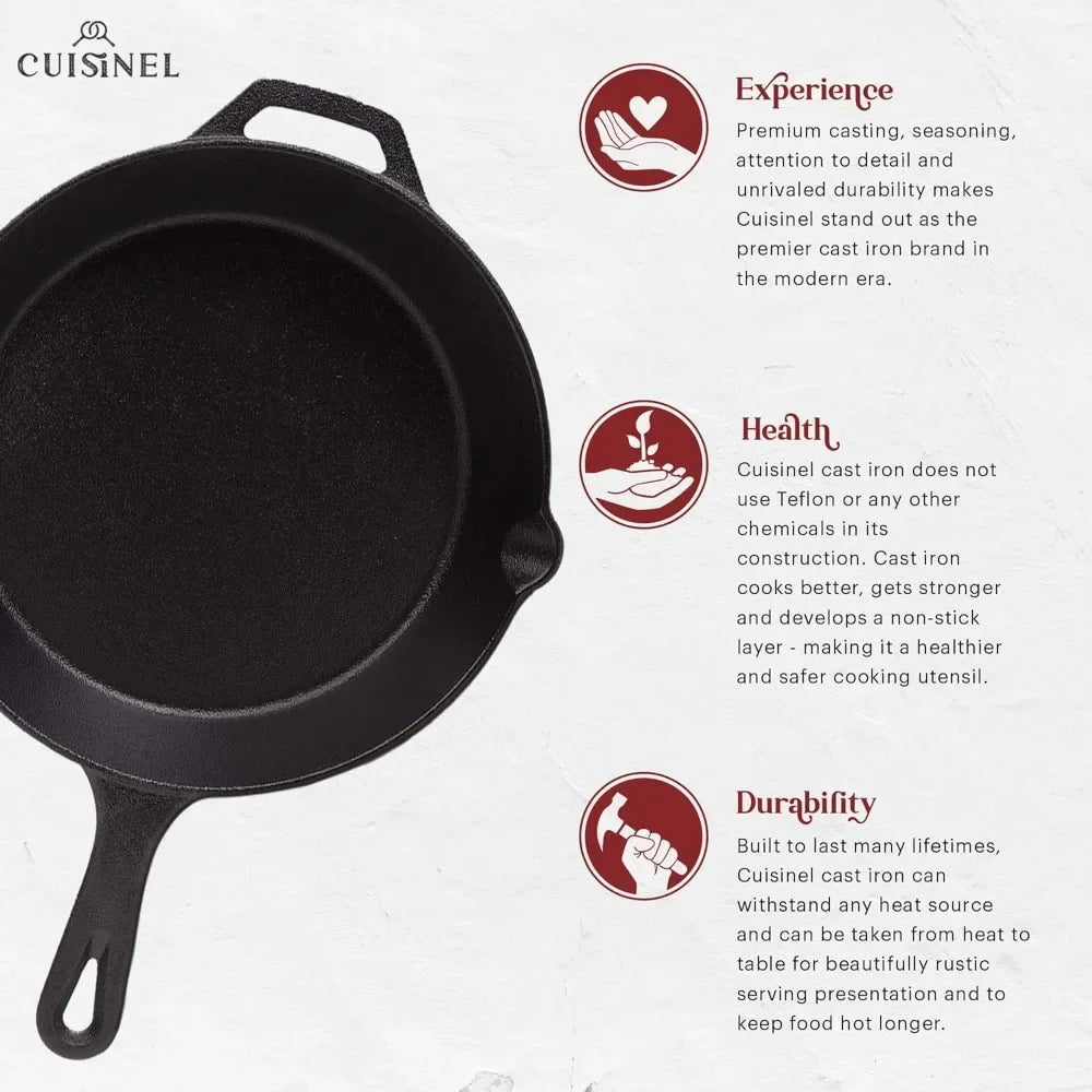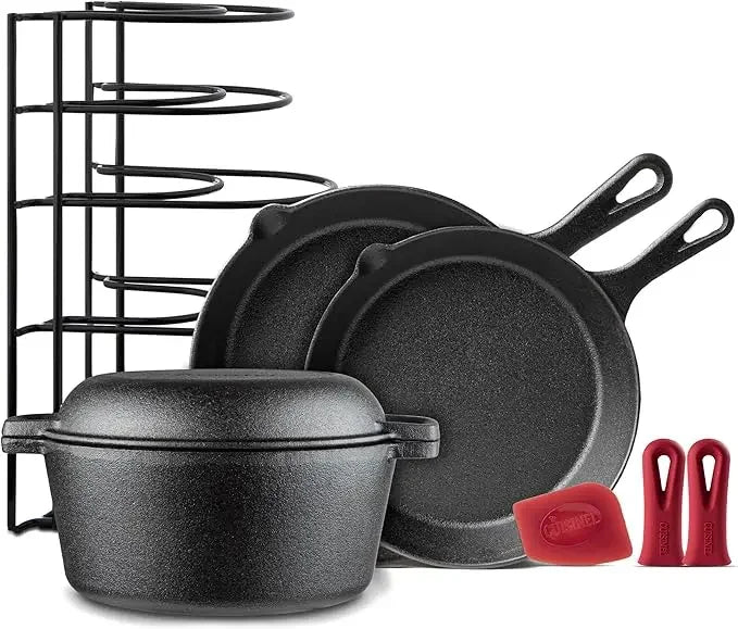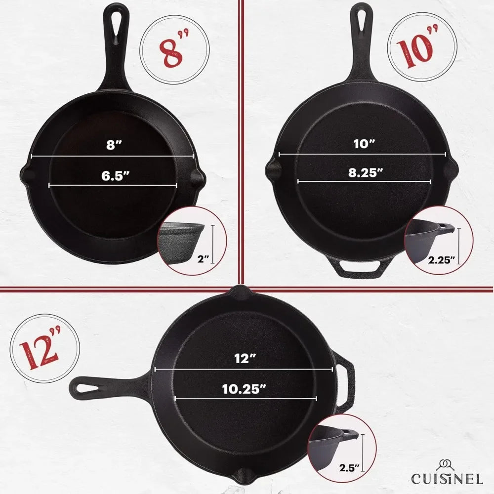 Cast Iron Skillet Set - 8" + 10" + 12"-Inch Pre-Seasoned Frying Pans + Silicone Handle Grip Covers - Use Indoor/Outdoor