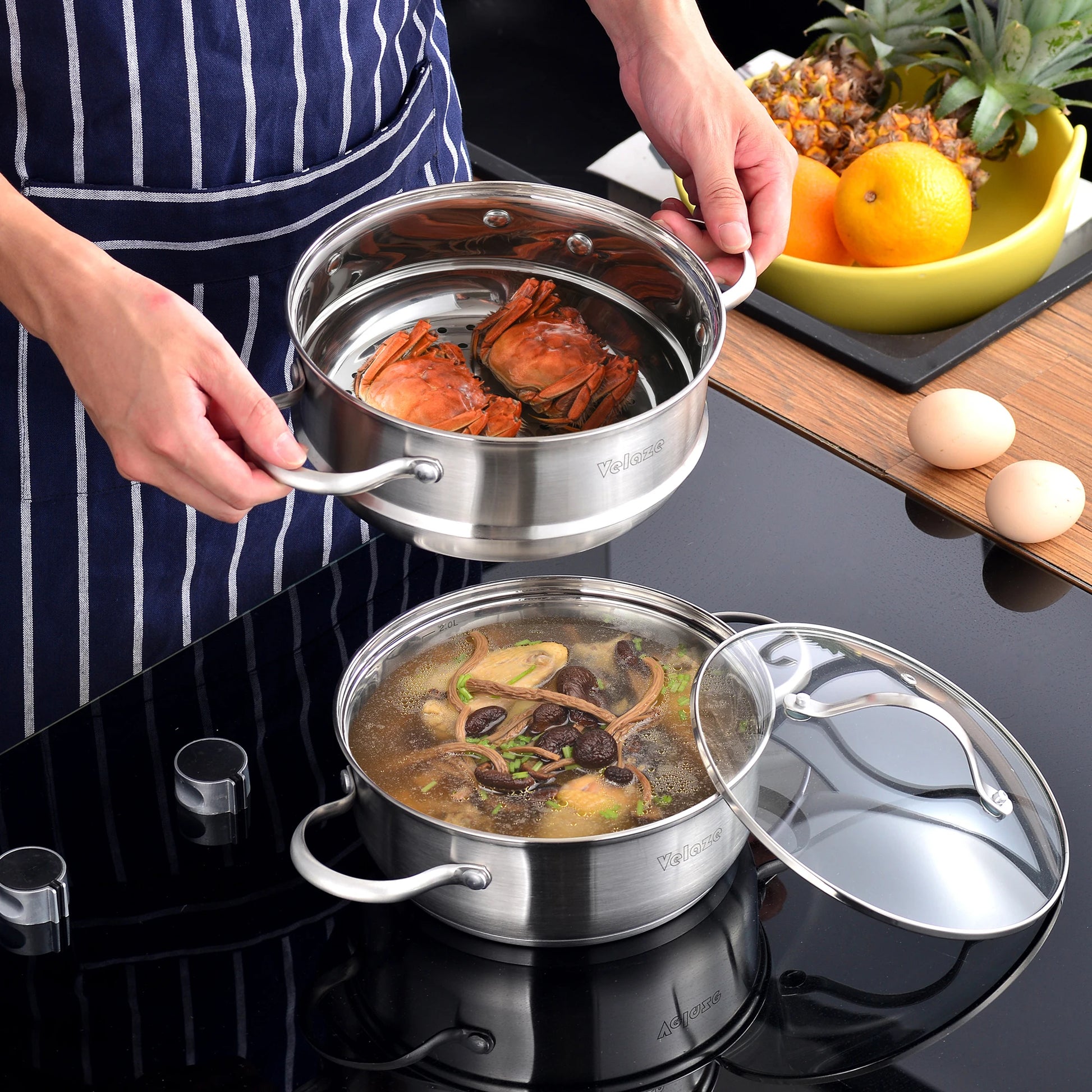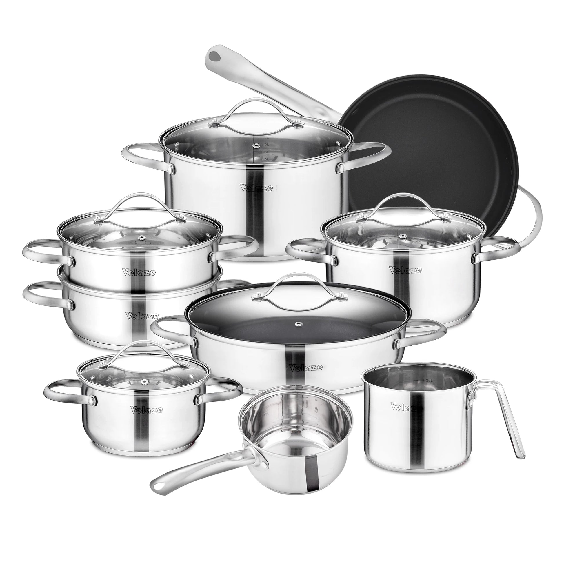 Velaze, Miki, 8/9/14 Pieces - Set of Pots and Pans, Cookware Battery Chef Casserole in Stainless Steel Chrome Suitable for Induction Plates, Glass Lid, Silver